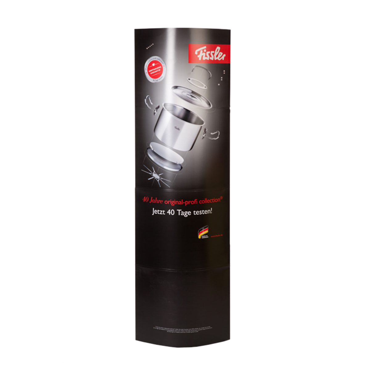 Die Kosten für Lagerung und Transport sind durch die kleine Größe des gefalteten Displays sehr gering und optimal für einen Einzelversand per Paketdienst.