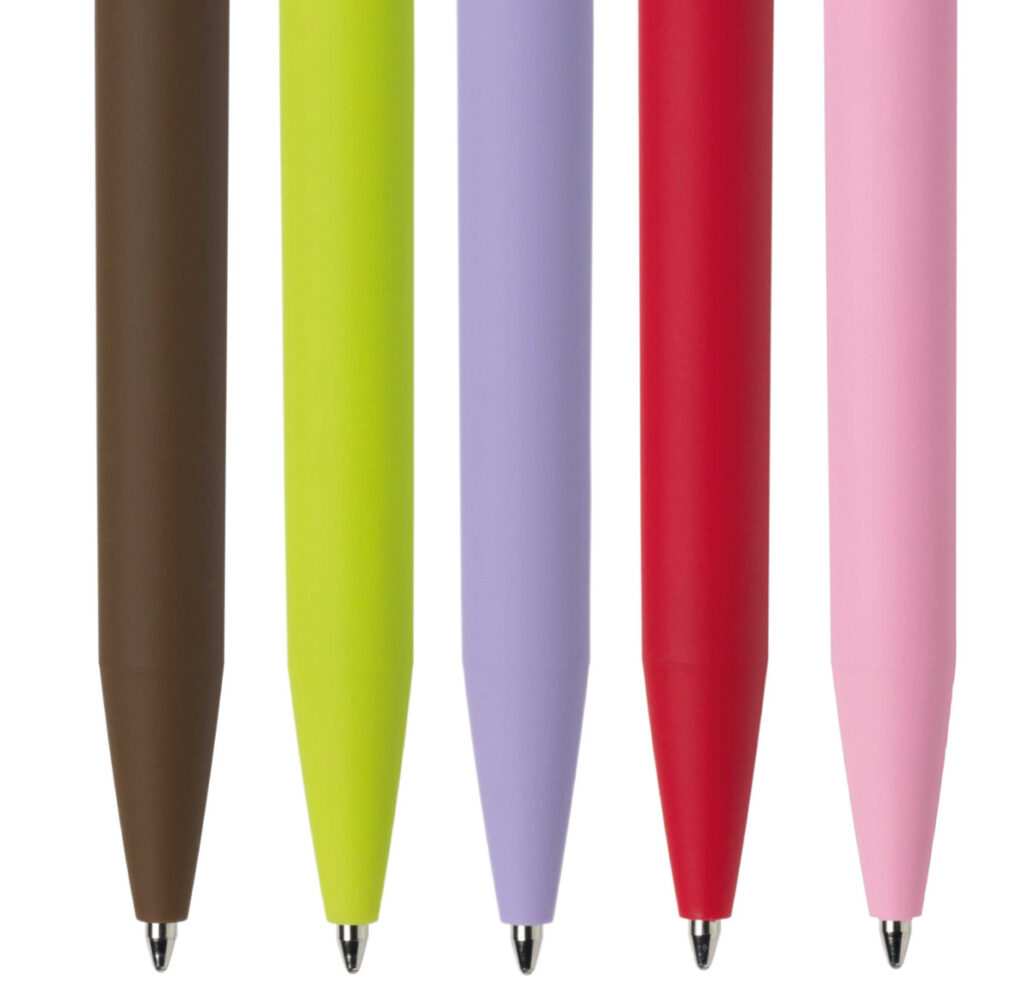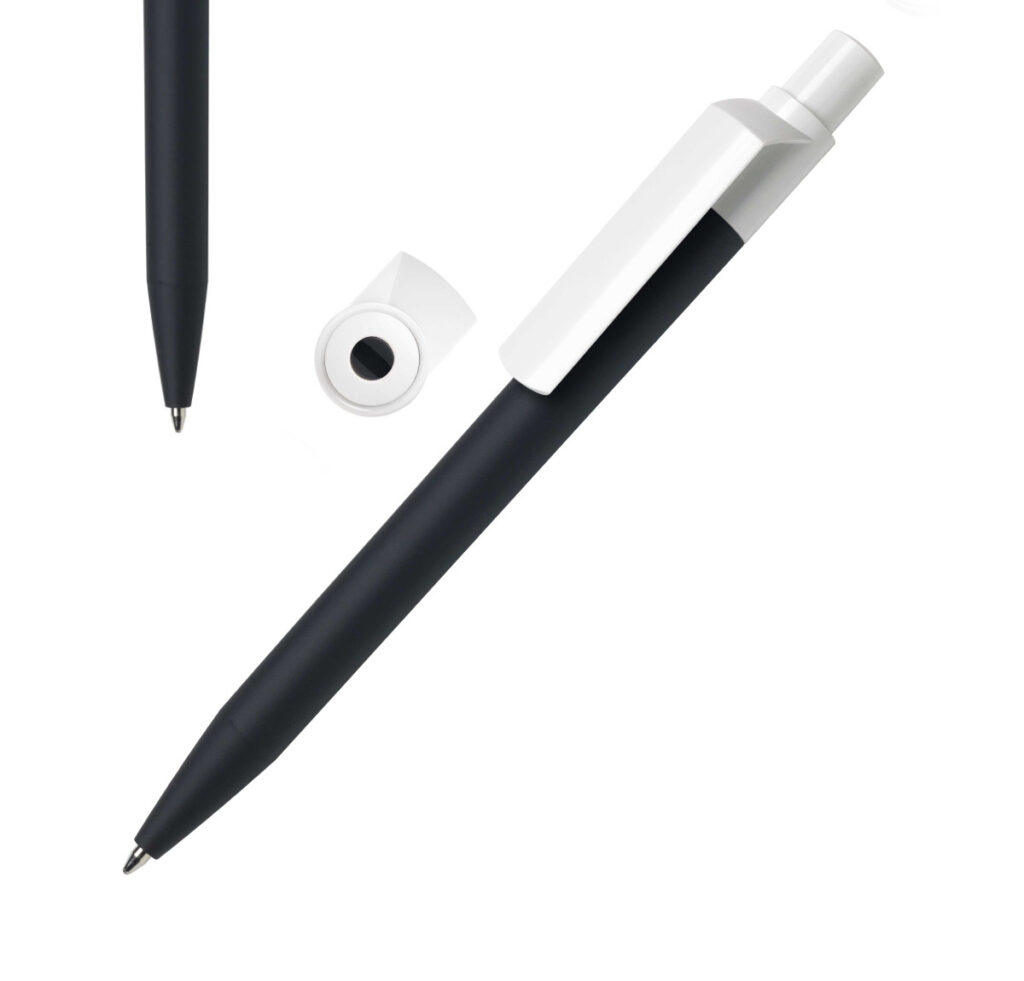 Druckkugelschreiber mit haptisch angenehmer Softtouch Oberfläche auf dem Schaft, in klarem und dezentem Design und farbigem Drückerpunkt.